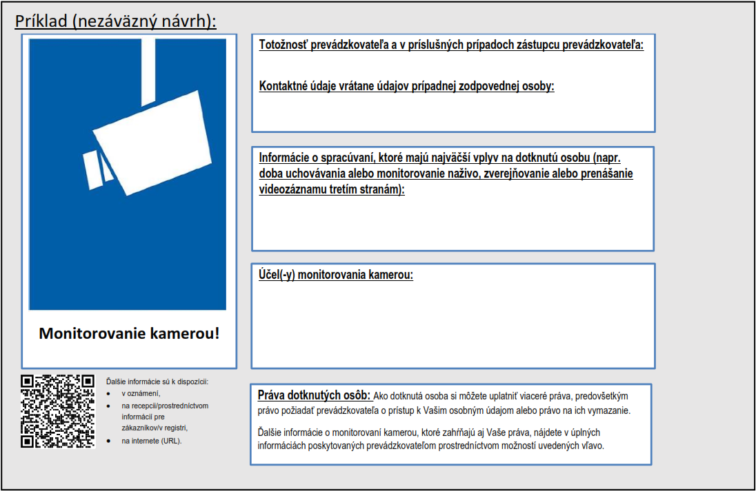 Obrázok č. 1 obsahuje všetky potrebné informácie, ktoré je prevádzkovateľ povinný poskytnúť dotknutým osobám pri vstupe do monitorovaného priestoru v prvej vrstve v súlade s čl. 5 ods. 1 písm. a) GDPR nariadenia (zásada transparentnosti). Tieto údaje musí poskytnúť pred ich získavaním alebo najneskôr v momente ich získavania. Prvá vrstva obsahuje informácie pre dotknuté osoby o prevádzkovateľovi, účeloch spracúvania, a ďalšie informácie na zabezpečenie spravodlivého a transparentného spracúvania jej osobných údajov. Súčasne by mala prvá vrstva obsahovať informáciu, kde dotknutá osoba nájde všetky ďalšie potrebné informácie. Tieto doplňujúce informácie môžu byť odkazom na spracúvanie osobných údajov (napr.: odkazom na webovú stránku alebo nástenku), kde existuje väčší priestor pre viacvrstvový prístup k podmienkam spracúvania osobných údajov a právam dotknutých osôb.